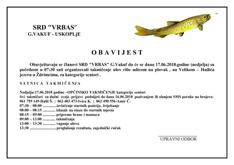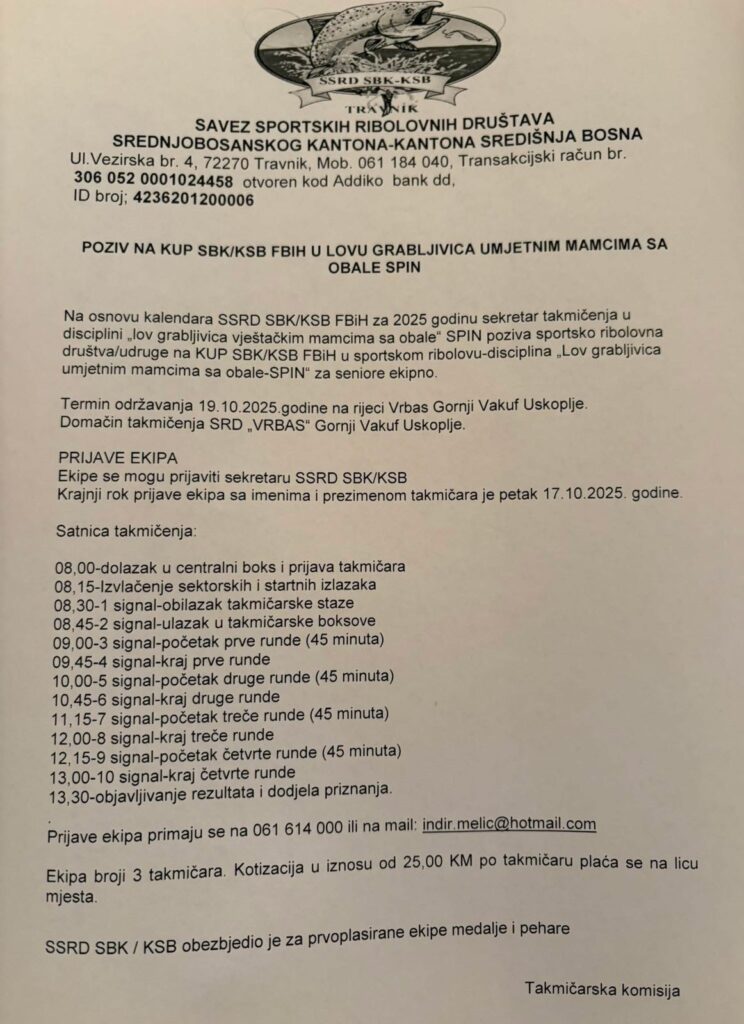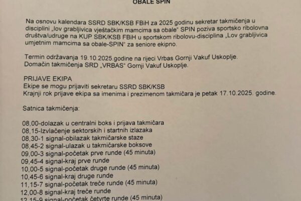 Na danasnjoj sjednici upravnog odbora Srd “Vrbas” Gornji Vakuf – Uskoplje je donesena odluka da je zatvorenje ribolovne sezone za 2025 godinu predvidjeno za 04.10.2025 Subota a ujedno ce se održati i opštinski spin kup na spin stazi Carski most svi takmičari koji žele da se prijave mogu to ućiniti na brojeve telefona 061 494…