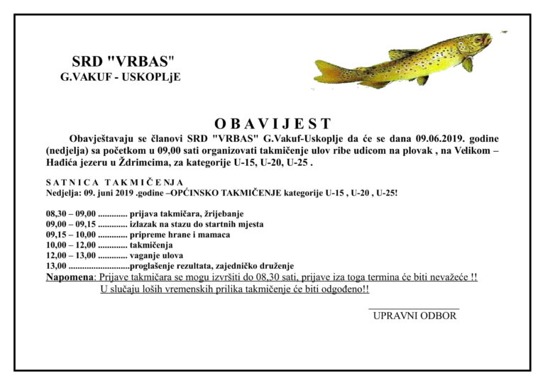 Poštovani članovi Srd Vrbas “Gornji Vakuf – Uskoplje da vas obavjestimo stigle su ribolovne dozvole za 2026 godinu za izdavanje istih možete se obratiti riboćuvaru Šisić Enesu 062- 950 – 015 Bistro