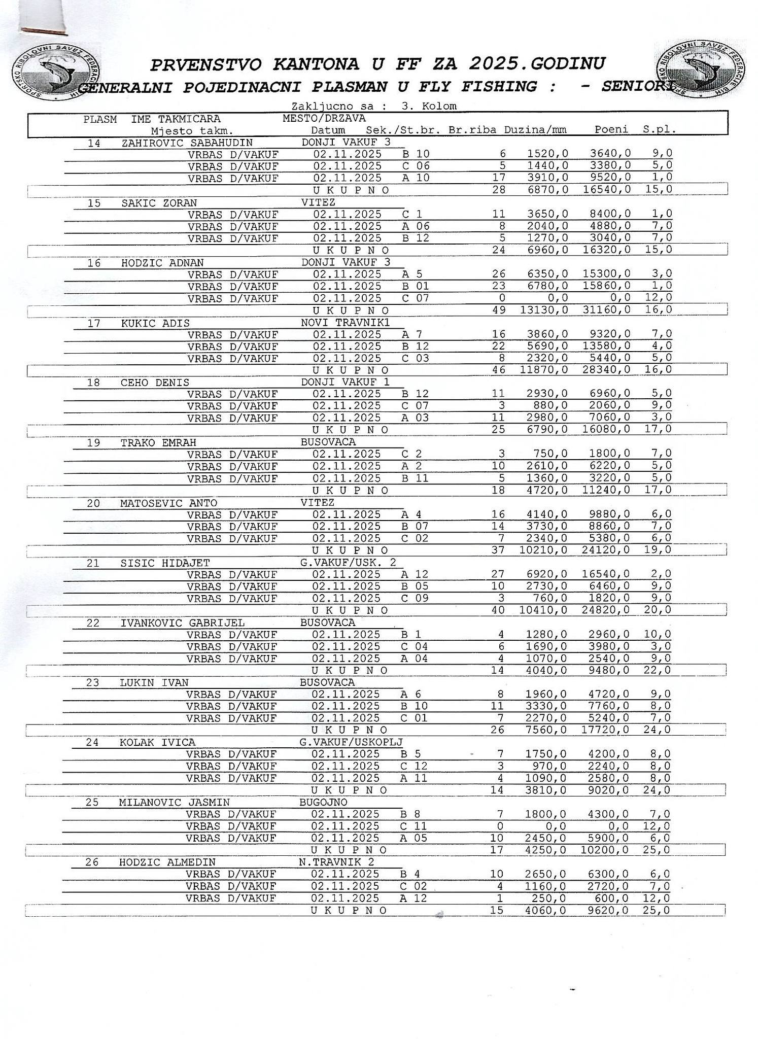 3. mjesto u pojedinačnoj konkurenciji, osvojio je Ohran Elvir, Srd Vrbas Gornji Vakuf-Uskoplje, sa zbirom negativnih poena 9 (2+2+5) i ulovljenih 31 riba… Čestitamo našem Elviru na dobrom plasmanu u jakoj konkurenciji